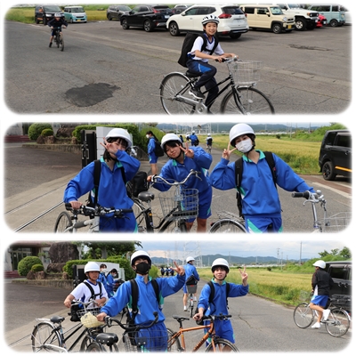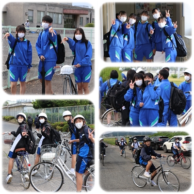 今日は池野小学校であいさつ運動を行ったため、参加した生徒たちは自転車での登校となりました。いつもとは少し違った下校風景です。