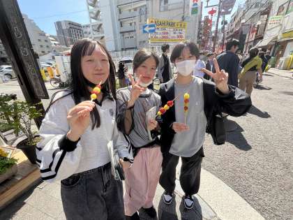 中華バイキングの昼食後、中華街で食べ歩きしています。