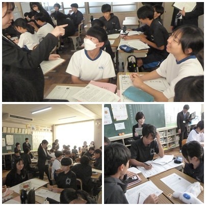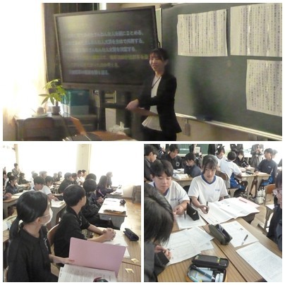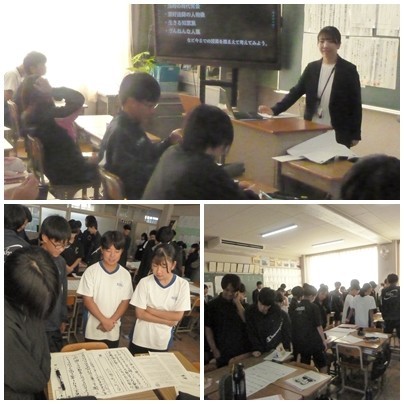 今日は3年生の教室で教育実習生による道徳の授業が行われました。高校入試の面接練習を場面にして、どのようにすれば礼儀正しくできるか考えることができました。