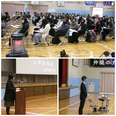 今日は、新入生と保護者の方に入学説明会を行いました。大寒の次の日のため、寒い一日となりましたが、代表生徒からの学校紹介、担当教員からの説明、部活動見学などがありました。