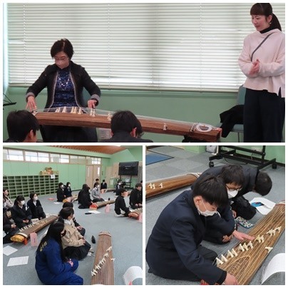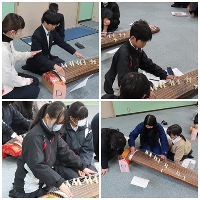 先週に引き続き、1年生は箏の先生に来校いただき、指導を受けています。会議室から「さくら・・・さくら・・・」と聞こえてくる箏の音色はなんとも心地よいものです。日頃は映像や音声のみで聞いている箏です。今日は自分で素敵な演奏ができました。