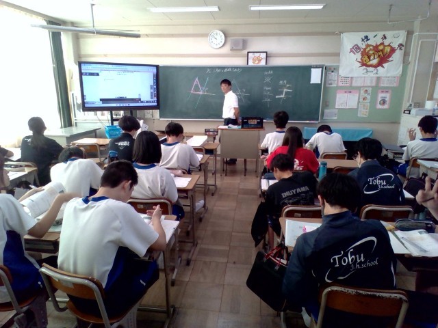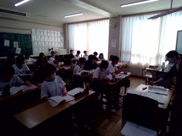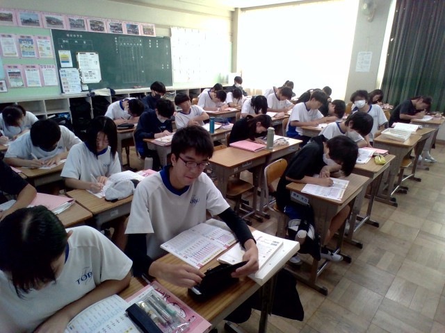 国語の授業では漢字の確認テストが行われていました。社会では地理を学習していました。数学の授業では単元テストを行っていました。