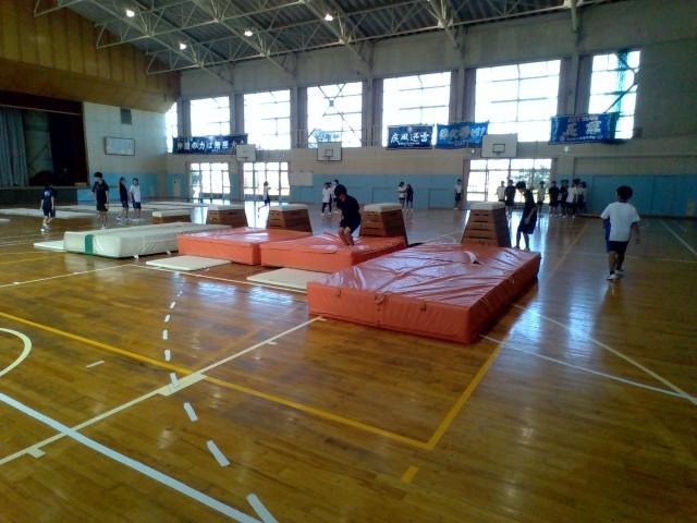 英語と体育の授業の様子です。体育の授業では跳び箱とマット運動をやっていました。