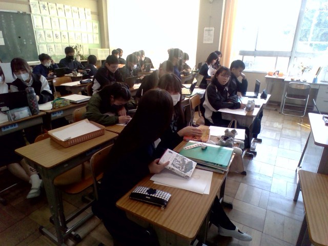 美術の授業ではグラフィックデザインについて学習しています。本の表紙のデザインを考えていました。