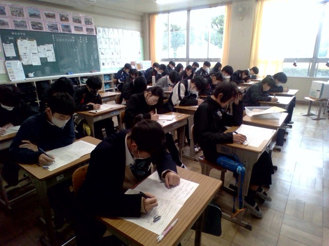 本日、実力テストを実施しています。生徒たちは真剣な表情でテストに取り組んでいます。