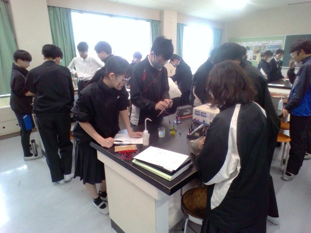 理科の授業で、水溶液に電流が流れるかを調べる実験を行いました。塩酸やエタノールなど、液体の種類によって電気が流れるものと流れないものがあることを、実験を通して発見しました。