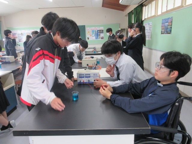 理科の授業では、塩化銅水溶液の電気分解の実験を行いました。電流を流した際に、陰極と陽極にどのような変化が起こるかを観察し、それぞれの極から発生した物質の正体を詳しく確かめることができました。 -